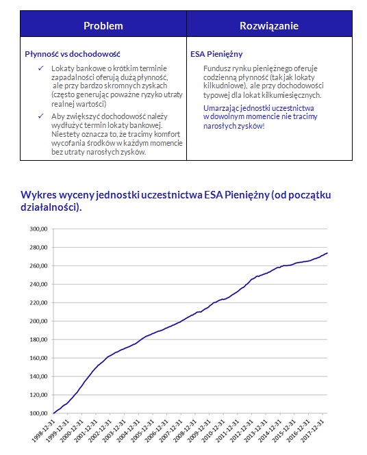 Informacje na temat ESALIENS Subfunduszu Pieniężnego („subfundusz"), wydzielonego w ramach ESALIENS Parasol FIO („fundusz") zawarte są w prospekcie informacyjnym oraz w kluczowych informacjach dla inwestorów, które są dostępne na stronie internetowej www.esaliens.pl, w poszczególnych punktach dystrybucji funduszu, jak również w formie pisemnej w siedzibie funduszu. Prospekt informacyjny funduszu i kluczowe informacje dla inwestorów zawierają informacje niezbędne do oceny inwestycji, wskazują ryzyko uczestnictwa w funduszu, koszty, opłaty i informacje o podatkach. Przed zainwestowaniem w subfundusz należy zapoznać się z kluczowymi informacjami dla inwestorów dotyczącymi wybranej kategorii jednostki uczestnictwa subfunduszu, jak również z prospektem informacyjnym funduszu. Dotychczasowe wyniki subfunduszu nie stanowią gwarancji osiągnięcia podobnych wyników w przyszłości. Wyniki subfunduszu nie uwzględniają podatku od dochodów kapitałowych oraz opłat związanych z nabywaniem jednostek uczestnictwa. Indywidualna stopa zwrotu zależy od dnia nabycia oraz odkupienia jednostek uczestnictwa, a także od wielkości pobranych opłat manipulacyjnych i wysokości należnego podatku. Fundusz nie gwarantuje realizacji założonego celu inwestycyjnego subfunduszu ani uzyskania określonego wyniku inwestycyjnego. Uczestnik funduszu musi liczyć się z możliwością utraty przynajmniej części wpłaconych środków. Fundusz może lokować więcej niż 35% wartości aktywów subfunduszu w papiery wartościowe emitowane przez Skarb Państwa, Narodowy Bank Polski, Europejski Bank Odbudowy i Rozwoju lub Europejski Bank Inwestycyjny oraz w papiery wartościowe emitowane przez państwo członkowskie, jednostkę samorządu terytorialnego, jednostkę samorządu terytorialnego państwa członkowskiego. Niniejszy materiał ma wyłącznie charakter promocyjny, a wykresy, diagramy i zestawienia w nim zawarte należy traktować jako ilustrację, nie prognozę. Materiał ten nie stanowi oferty w rozumieniu Kodeksu cywilnego ani oferty publicznej w rozumieniu ustawy o ofercie publicznej i warunkach wprowadzania instrumentów finansowych do zorganizowanego systemu obrotu oraz o spółkach publicznych, doradztwa inwestycyjnego, innego rodzaju doradztwa, ani rekomendacji do zawarcia transakcji kupna lub sprzedaży jakiegokolwiek instrumentu finansowego, jak również innych informacji rekomendujących lub sugerujących strategie inwestycyjne. Źródło danych: obliczenia własne ESALIENS TFI SA, dane dla średniej rynkowej - Analizy Online SA. ESALIENS TFI SA działa na podstawie decyzji z dnia 18.06.1998 r. wydanej przez Komisję Papierów Wartościowych i Giełd.